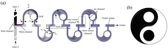 The geometric structure of the proposed passive micromixer is illustrated in Figure 1a. Two streams of fluid enter from the T-shape inlets and gather into the main channel where the initial contact occurs. Subsequently, the co-fluid flows through several mixing units, which contain a long corner channel, a circular cavity, an arc channel, and a short corner channel. The corner channel can induce vortex generation while the circular cavity and the arc channel can generate secondary flow. Moreover, an unbalanced collision will take place at the exit of the arc channel due to its variable width ratio. The collision and the vortex will enhance the disturbance between the flow layers and result in better mixing efficiency (M).