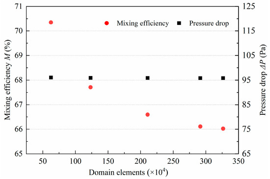 Mesh generation is an important part of numerical simulations. With the increase of domain elements, the accuracy of the results would certainly be improved. However, in this regard, the calculation time would be therefore further prolonged. Simulations were performed on the same model with different domain elements to obtain a balance between result accuracy and computational efficiency. The numbers of elements were selected as 62.65 × 104, 123.36 × 104, 210.82 × 104, 291.63 × 104, and 326.51 × 104. Due to the local complex structure of the proposed micromixer, a hybrid mesh is employed, i.e., a structured mesh was used for the regular parts, such as the inlet and main channels, while an unstructured mesh was used for the complex parts, such as the mixing units. The M and pressure drop under different domain elements are presented in Figure 2. It can be observed that the number of elements had almost no effect on pressure drop, while M tended to sharply decrease with the increase of elements number. The M decreased by 2.64%, 1.12%, 0.48%, and 0.09%, respectively. Therefore, to improve the numerical simulation efficiency while ensuring high accuracy, the domain elements of 210.82 × 104 were selected.
