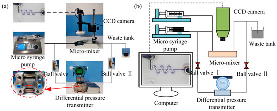 The mixing experiments were conducted on a self-built experimental platform using the micromixer with an optimized structure (Figure 4). The selected mixing media were deionized water and inked deionized water. During the experiment, the two streams of fluid can be injected into the micromixer at a certain velocity through a micro-syringe pump. A charge-coupled device (CCD) camera placed above the mixer was used to observe the fluid flow in real time, while a differential pressure transmitter connected the inlet and outlet was employed to measure the pressure drop of the entire mixing system. The M can be obtained by performing grayscale processing on the images captured by the CCD camera, according to the following equations: