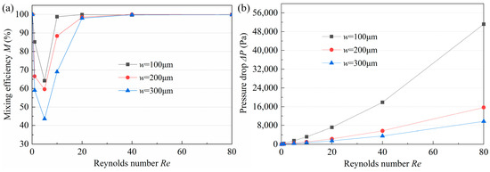 Influence of w on (a) mixing efficiency and (b) pressure drop.