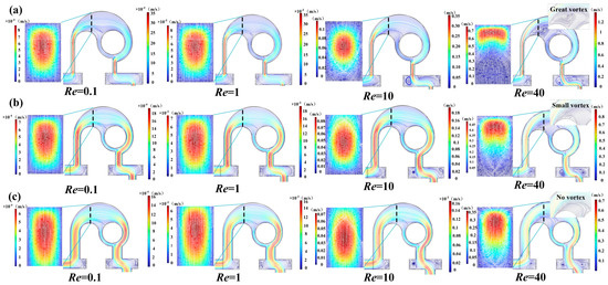Simulation results of flow velocity in the micromixers with (a) w = 100 μm, (b) w = 200 μm, (c) w = 300 μm at different Re numbers.