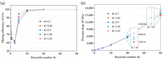 Influence of K on (a) mixing efficiency and (b) pressure drop.