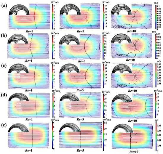 Simulation results of streamlines of velocity at the A-A section (Figure 1) and in the circular cavity of the micromixers with (a) K = 6.7, (b) K = 3.85, (c) K = 2.9, (d) K = 1.95, and (e) K = 1.63 at typical Re.