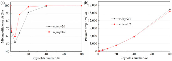 The arc channel of the proposed micromixer refers to the study of Ansari [32], i.e., the width ratio is selected as 2, which can lead to an unbalanced collision between the two fluids during recombination due to differences in the flow velocity. Considering the asymmetrical structure of the proposed mixer, the micromixers with w1/w2 = 1/2 and w1/w2 = 2/1 were investigated. Figure 9 demonstrates the mixing efficiency and pressure drop of the two micromixers at Re of 0.1–80. When Re is too high (Re > 40) or too low (Re < 1), the w1/w2 has little effect on efficiency. This is because the mixing depends on molecular diffusion at low Re, and the channel length plays a key role in the mixing degree, while the effect of the structure is negligible. At high Re, a high-intensity vortex and secondary flow are generated, resulting in saturated mixing. At medium Re, the weaker molecular diffusion and chaotic convection make the width ratio have a significant influence on M, and as it can be seen in Figure 9a, the micromixer with w1/w2 = 1/2 has obvious advantages. Moreover, by comparing Figure 9a,b, it can be found that the ΔP of the micromixer with w1/w2 = 1/2 at low Re is almost the same as that of the one with w1/w2 = 2/1, and ΔP at high Re is even lower. This indicates that the performance of the micromixer with w1/w2 = 1/2 is much better.