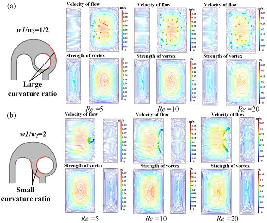 Simulation results of flow velocity and vortex strength at the B-B section of the micromixers with (a) w1/w2 = 1/2 and (b) w1/w2 = 2/1 at typical Re.
