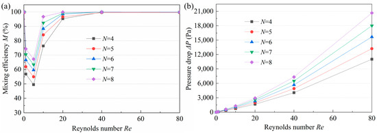 The M is closely related to the length of the mixing channel. The longer the channel, the longer the residence time, which leads to a higher M. However, a longer channel would increase the mixing time and would not be suitable for applications requiring rapid mixing. Moreover, after a certain length, the effect of channel length on M is insignificant. The number of mixing units should be reasonably selected to achieve a balance between M and mixing time. The M and pressure drop of micromixers with 4, 5, 6, 7, and 8 mixing units are displayed in Figure 10. When Re > 0.1 or Re < 40, M increases with the increase of N, but the increase rate tends to be progressively smaller. According to Figure 11a, at high Re, the M of the micromixers with different N is almost the same. This means that the mixing has reached saturation. Moreover, N and ΔP are positively correlated, i.e., the larger the N, the higher the ΔP, especially at higher Re. After comprehensive consideration, an N of 6 was selected to guarantee high efficiency and low pressure drop.