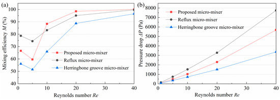 Comparison of the (a) mixing efficiency and (b) pressure drop of the proposed micromixer and the other two micromixers.