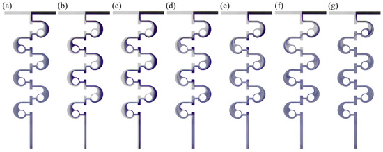 Experimental results of fluid flow state in a micromixer at different Re numbers: (a) Re = 0.1; (b) Re = 1; (c) Re = 5; (d) Re = 10; (e) Re = 20; (f) Re = 40; (g) Re = 80.