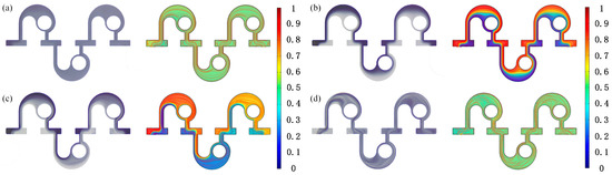 The numerical analysis of the proposed micromixer was performed using COMSOL Multiphysics 5.4. The mixing medium used was deionized water with a density and kinematic viscosity of 1 × 103 kg/m3 and 9.7 × 10−4 Pa·s, respectively. The modules of laminar flow and transport of diluted species were selected for the numerical simulation. Boundary conditions of velocity inlet and pressure outlet were employed. The same velocities were set and the pressure at the outlet was set as 0. The concentrations of the two inlets were 0 and 1 mol/m3, and the no-slip condition was applied to the channel walls. The fluids with different concentrations were marked blue and red to facilitate the visualization of mixing. The mixing of fluids was investigated under different Reynolds numbers Re, whose expression is: