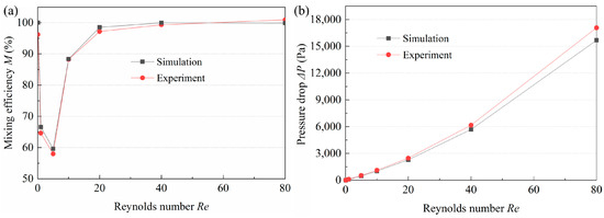 Comparison of the (a) mixing efficiency and (b) pressure drop between the experimental and simulation results.