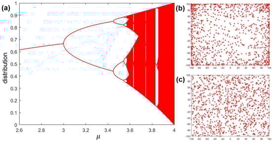 (a) The trajectory of the logistic map among the range 2.6–4; (b) the distribution of 1000 particles followed the logistic map; and (c) the distribution of 1000 particles was random.