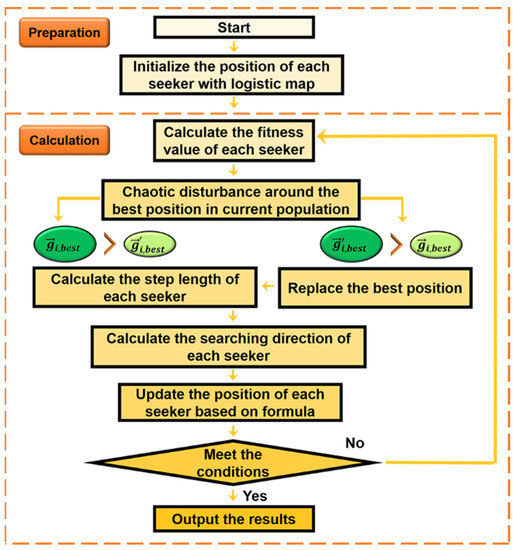 where is the updated global optimal position after chaotic disturbance . The chaotic disturbance rules comply with Equation (12). Thus, both the search step length and search direction are updated. The specific procedure is as follows.