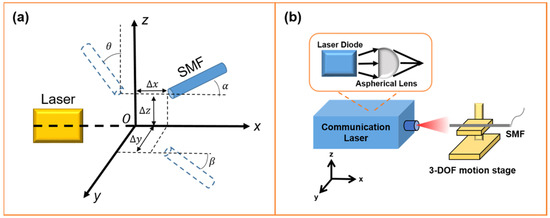 Figure 4a depicts the schematic of laser–SMF coupling in a 6-DOF motive stage, where are the motion errors of the X, Y, and Z axes, respectively. represent the alignment angle errors for rotations about the X, Y, and Z axes, respectively.