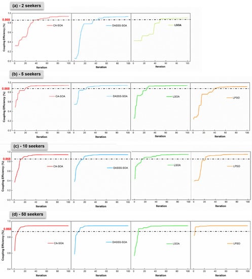 Based on Equation (19), the optimal value of coupling efficiency was 0.877 when combined with Table 2. Therefore, the terminal condition of algorithm iterations was set to 99% efficiency (0.868). Table 3 shows the search performance of the proposed CASOA with different numbers of seekers.