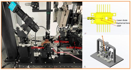 In Equation (18), represents the coupling efficiency, which is computed by the overlapping integral of the fields in any plane. is the coupling efficiency in the vertical junction plane, and is the coupling efficiency in the parallel junction plane. is the wavelength of the laser (1310 nm), is the mode field radius of the SMF, and is the mode field radius of the LD in the vertical junction plane. is the linear deviation of the center of the LD and SMF mode field in the vertical junction plane, and is the motive error for the Z axis of the LD and SMF. Because the angular alignment is adjusted by the fixture (shown in Figure 4b), the expression for the coupling efficiency (Equation (18)) is simplified to