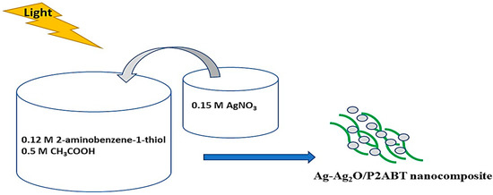 On the other hand, the Ag2S-Ag2O-Ag/P2ABT nanocomposite was prepared through the photopolymerization of (0.12 M) 2-aminothiophenol using (0.15 M) AgNO3, in which acetic acid was used as the acid and solvent. Through this reaction, the Ag2S-Ag2O-Ag/P2ABT nanocomposite formed with its grayish-green color (Figure 1).