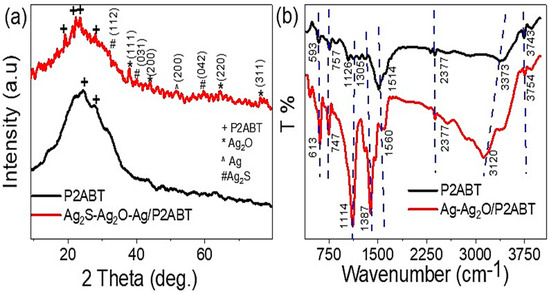 (a) The XRD and (b) FTIR for the prepared P2ABT and Ag2S-Ag2O-Ag/P2ABT nanocomposite.