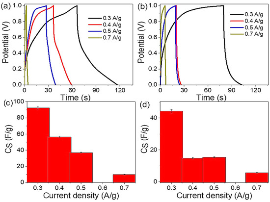 The charge/discharge study was performed through 0.3 to 0.7 A/g as illustrated in Figure 4a,b from the HCl and NaOH medium, respectively. The current density has a great effect on the charging behavior of the supercapacitor; the reverse relation of the current density with the charge storage appears clearly through the charge curves. Under high values of current density, the supercapacitor does not have sufficient time for charge storage [11,13,50]. There is greater enhancement in the charging behavior in the acid medium, in which the produced charge times are 118 s and 103 s. In addition to this greater time, the produced curve shows greater performance. This performance confirms the high mobility of the H+ ion and then the charge storage that motivates the role of the fabricated pseudo-capacitor; this matched with the previous literature [51,52], in which this ion has the ability as a proton jump that accelerates movement, and then, this ion has a great interaction with the composite for charge storage [53]. At the same time, the high porosity of the nanocomposite facilitates the penetration of these ions to its surface [54,55]. Despite OH− (basic medium) having the same phenomenon of proton jumping, the basic nature effects on the polymer material decrease its conductivity [56], and then, the energy storage decreases.