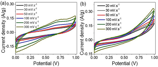 The fabricated Ag2S-Ag2O-Ag/P2ABT nanocomposite pseudo-capacitor showed different behavior for the produced cyclic voltammetry study in the acidic and basic mediums as demonstrated in Figure 5a,b, correspondingly. When increasing the applied scan rate from 50 to 300 mV·s−1, the produced area under the cyclic curve increases well; this is related to the charge storage enhancements with scan rate values that are reflective of the redox reactions inside the supercapacitor [59,60]. From Figure 5a,b, the acid medium has a great effect on the enhancement of the charge storage, in which the produced cyclic curve is almost rectangular with a great area under the curve, while in the basic medium, the curve has a narrow area related to the small energy storage on the plates.