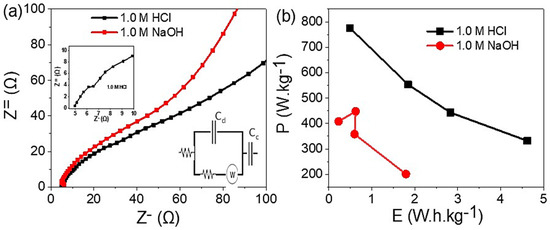 The statement further clarifies the charge transfer behavior of the Ag2S-Ag2O-Ag/P2ABT nanocomposite pseudo-capacitor by introducing the Randles circuit [11], represented in Figure 6a. The solution resistance (Rs) and charge transfer resistance (Rct) of the system are illustrated from the Randles circuit. In the acid medium, the Rs and Rct values of the Ag2S-Ag2O-Ag/P2ABT nanocomposite pseudo-capacitor were found to be 4.9 and 1.5 Ω, respectively. This is indicated by the small semicircle observed in the Nyquist plot. On the other hand, in the basic medium, the Rs and Rct values are 6.2 and 1.6 Ω, respectively. The results obtained from the Randles circuit analysis support the conclusion that the acid medium facilitates the charge transfer process in the system. This is consistent with the findings from the Nyquist plot analysis. In summary, the Randles circuit analysis provides further evidence to support the role of the acid medium in enhancing the charge transfer performance of the Ag2S-Ag2O-Ag/P2ABT nanocomposite pseudo-capacitor. Under the great charge transfer of the nanocomposite using the HCl electrolyte, a magnified curve is inserted in Figure 6. The Ragone plot [61] indicates the greater enhancement of the power energy (P) in the acid medium (Figure 6b).