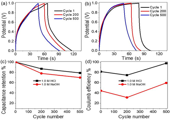 For the fabricated Ag2S-Ag2O-Ag/P2ABT nanocomposite pseudo-capacitor’s stability, its performance was determined through an electrochemical charge study until 500 cycles from the acidic and basic mediums, Figure 7a,b, correspondingly. At 0.3 A/g, from these figures, the medium has a great effect on the stability of the fabricated pseudo-capacitor. The supercapacitor has retention stability values of 87% and 79% in the acidic and basic mediums, respectively, until 200 cycles. The capacitance retention and the coulomb efficiency (ɳ, using Equation (5)) [62] under these different electrolytes are represented in Figure 7c,d, correspondingly. This good stability under an acid medium confirms the conductivity enhancement of the polymer under the effect of H+ ions on the prepared polymer materials [13,63]. For additional information, we compared the efficiency of this fabricated supercapacitor with previous studies as mentioned in Table 1.