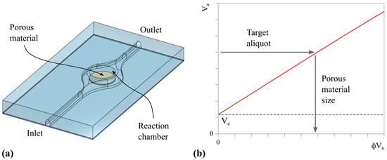 (a) Scheme of the microfluidic chip designed to implement valveless aliquoting and the necessary parts. (b) Plot of the effectively retained aliquot as a function of the nominal volume of the porous material, according to the theoretical correlation given by Equation (2).