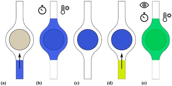 Schematic representation of a series of operations that integrates aliquoting: (a) Injection of the first reagent (blue) into the chamber. (b) First reaction during a given time at a specified temperature. (c) Removal of the excess liquid and aliquoting in the porous material. (d) Injection of the second reagent (yellow) into the chamber. (e) Mixing (green), second reaction during a given time at a specified temperature, and final readout.