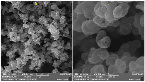 With slight modifications, the ZnO HQSs were prepared in accordance with the previous work [68]. In the first step, 100 mL of polyethylene glycol (PEG) was used to dissolve 10 mmol (2.973 g) of Zn(NO3)2·6H2O under magnetic stirring (30 min) and ultrasonication (20 min) processes. After that, the mixed solution was added into a flask, and it was gradually heated to 160 °C. The process of refluxing was maintained at 160 °C with stirring for 6 h. The produced material was gathered by centrifugation, washed (several times) with ethanol and water, and then dried for 12 h at 60 °C. In the end, the white ZnO HQSs were prepared by calcining the dried material for four hours at 500 °C in a muffle furnace.