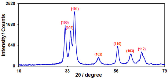 The phase purity and crystallinity of ZnO HQSs were verified by XRD analysis. In Figure 2, the XRD pattern is displayed. The diffraction peaks located at 31.9°, 34.4°, 36.4°, 47.6°, 56.7°, 62.9°, and 68.1° correspond to diffraction from the (100); (002); (101); (102); (110); (103); and (112) planes of ZnO, respectively. All the peaks are indexed to the hexagonal ZnO with a wurtzite structure (JCPD No. 36-1451) [69,70].