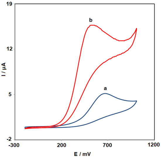 Figure 3. CVs of (a) unmodified SPGE and (b) ZnO HQSs/SPGE in the exposure to 100.0 µM carmoisine in 0.1 M phosphate buffer (pH = 7.0) at 50 mV s-1.