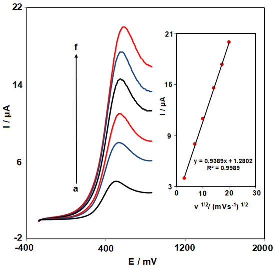 The following stage involved determining how the scan rates affected the oxidation peak current of carmoisine (Figure 4). The recorded LSVs show that the oxidation peak current of carmoisine increased with the increase of scan rate. After recording the voltammograms at different scan rates, the plot of the current intensity (Ip) versus the square root of the scan rate (υ1/2) was drawn (Figure 4 (Inset)). According to the linearity of the resulting plot (regression equation: y = 0.9389x + 1.2802 with R2 = 0.9989), it was determined that the electrochemical reaction of carmoisine on the ZnO HQSs/SPGE is controlled through the diffusion phenomenon.
