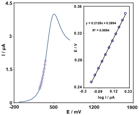 Then, a Tafel plot (Inset of Figure 5) has been drawn using data from the ascent of the I-E curve recorded at 10 mV s−1 (scan rate). The kinetic of electron transport between carmoisine and the ZnO HQSs/SPGE would have an impact on the Tafel area. Using Equation (1), the anodic transfer coefficient (α) can be obtained from the Tafel plot’s slope [71], as follows: