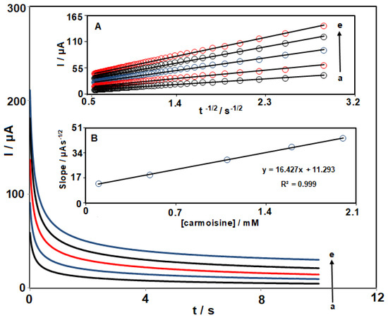 Figure 6. The chronoamperograms obtained for ZnO HQSs/SPGE in 0.1 M phosphate buffer (pH = 7.0; 0.1 M) containing various carmoisine concentrations (a: 0.1; b: 0.5; c: 1.1; d: 1.6; and e: 2.0 mM). I versus t−1/2 plots for recorded chronoamperograms (Inset (A)) and the slope of straight lines of graphs versus carmoisine concentrations (Inset (B)).
