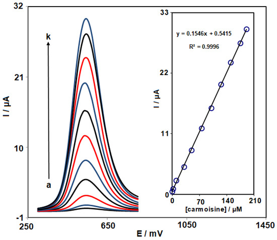 Given that DPV is more sensitive than other quantitative methodologies, this approach has been utilized to investigate the linear range and LOD. For DPV measurements, the following parameters have been employed: pulse amplitude (0.025 V), step potential (0.01 V), initial potential (300 mV), end potential (804 mV), and scan rate (50 mV s−1). For the purpose of this investigation, the DPVs of the ZnO HQSs were recorded for carmoisine with various concentrations. The data (Figure 7) show a linear relationship between the Ip and carmoisine concentration (in the range 0.08–190.0 µM) at the ZnO HQSs-SPGE surface. A detection limit of 0.02 µM for carmoisine has been subsequently determined. The obtained LOD value and linear range are compared with the reported data from different works (Table 1). As shown in Table 1, the performance of ZnO HQSs-SPGE is comparable to or better to that of the previously reported sensors. Moreover, the proposed sensor has some advantages including saving time, being cost effective, and the simplicity of electrode preparation, which proved that the proposed sensor has relatively good performance and can be used for the determination of carmoisine in food samples.
