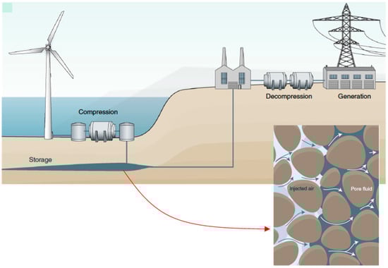 Conceptual diagram of compressed-air energy storage in porous media (PM-CAES) using a porous geologic formation as a storage medium. The image is edited from Bentham [].