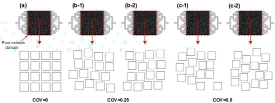 After obtaining the solid coordinates from the code, the information was utilized to replicate the pore structure using AutoCAD 2020 (Autodesk). For this study, two distinct pore structures were designed independently, corresponding to each COV value of 0, 0.25, and 0.5 (as shown in Figure 3). The fabricated micromodel devices had porosity values of 0.36 and 0.38 for COV = 0.25 and 0.5, respectively. Their permeability values were also determined through single-phase fluid flow tests (4.0–6.4 Darcy (=10−12 m2)) and were found to be in the same order.