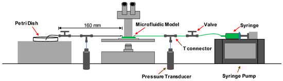 To observe the fluid transport within the main pore-network domain during the experiment, a microscope (LEICA S90) and a high-speed camera (LEICA MIC 190 HD) were utilized. Two pressure transducers (OMEGA PX309-100GV, Bienne, Switzerland) with a pressure range of 0–689 kPa and a sensitivity of 19.96 Pa/kPa were connected to the right and left sides of the micromodel, respectively, to measure the fluid pressure throughout the test. The data acquisition process was automated using a data logger (Keysight 34972A, Rosebery, Austrilia), a computer, and a DC power supply (Keysight E3630A). The complete experimental setup is depicted in Figure 4.