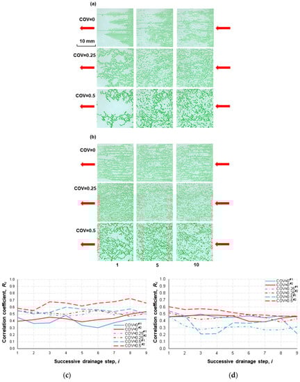 In contrast to the observations for Type I, the invasion pattern became more similar between steps in the heterogeneous pore network at Q = 0.01 mL/min. That is, Rc was larger for the higher COV (e.g., Rc = 0.3–0.5 at COV = 0 vs. Rc = 0.5–0.7 at COV = 0.5; Figure 5c). On the other hand, this effect of the COV no longer manifested as the flow rate increased (Figure 5d). Given that Rc was larger than 0.2–0.3 for all tested models, it can be presumed that 0.2–0.3 may be the lower limit of Rc for the tested geometry (square solids) with the structural heterogeneity of COV = 0–0.5 in this 2-D environment.