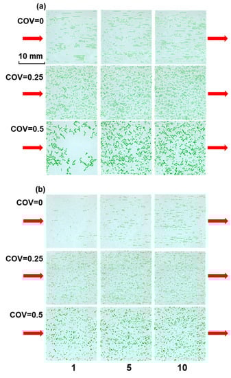 Similarly to Section 5.1, the distributions of the wetting (colorless oil) and residual nonwetting fluid (green-colored) at the end of selected imbibition steps are compiled in Figure 6. Compared with the results from Type I in Zhang et al. [], the distribution of the residual nonwetting fluid in Type II micromodels was more sporadic and random when COV = 0 (homogeneous). More of the nonwetting fluid also appeared to be stranded in the main domain of the pore space as the COV increased at both flow rates. However, like the Type I study, increasing the flow rate helped to reduce the residual nonwetting fluid in Type II (compare Figure 6a with Figure 6b). One important implication is that Type II appears to be more efficient than Type I in terms of the withdrawal of the nonwetting fluid (that is, a proxy for the withdrawal of air/hydrogen for an actual PM-CAES/UHS operation) under the given flow rates.