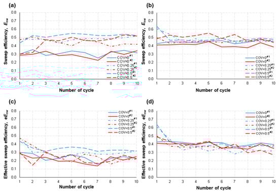 The analysis results are summarized in Figure 7. It appears that the COV exerted a meaningful influence on the occupation of nonwetting fluid at a relatively lower flow rate. That is, both the sweep and effective sweep efficiencies increased as the COV intensified (0 → 0.25 → 0.5) at Q = 0.01 mL/min (Figure 7a,c). This implies that it was relatively easier for the nonwetting fluid to displace the wetting fluid in the heterogeneous micromodels when the capillarity effect was dominant. In contrast, the effect of the COV was no longer manifest at Q = 0.1 mL/min (i.e., higher flow rate), being consistent with the above observations for drainage (Section 5.1).