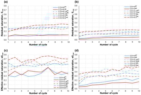 Noticeably, the residual saturation (both absolute and effective) was lowest in the homogeneous model (COV = 0) when Q = 0.01 mL/min (Figure 8a,c), which is exactly opposite to the Type I study results. This implies that the wider distribution of capillarity (i.e., COV → 0.5) might hinder the imbibition of the wetting fluid when the flow channels are rather straight with a low aspect ratio. The governance of the structural heterogeneity and the aspect ratio was persistent even with the increase in flow rate. That is, both the absolute and effective residual saturation of the nonwetting fluid was still lowest in the homogeneous model, which is then the same trend as Type I (Figure 8b,d).