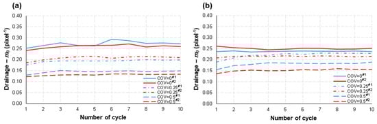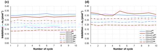 It can be interpreted that a larger normalized boundary length (m0) could suggest there are larger numbers of smaller fluid ganglia in the flow domain, as noted by Zhang et al. []. In this study, it was clearly observed that m0 decreased as the structural heterogeneity of the pore-network model was intensified (COV = 0 → 0.25 → 0.5) during both drainage and imbibition under the tested flow rates (Figure 9). This is the same trend as that in the Type I study by Zhang et al. [].