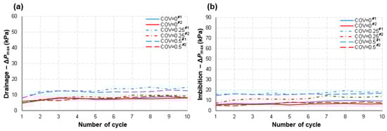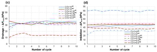 Lastly, we monitored the largest pressure drop across the model (ΔPmax) during the repetitive drainage–imbibition tests (Figure 10). A larger pressure gradient was needed for more heterogeneous models (COV → 0.5) at Q = 0.01 mL/min (e.g., lower flow rate) during both the drainage and imbibition processes. This is the opposite result from that of the Type I study by Zhang et al. []. Given that the average of the aspect ratios in these Type II models was almost 1 (cf., Type I: 5–6), the distribution of capillarity in each flow channel, associated with the viscosities of the fluids, might be the main contributor to the pressure drop during the fluid flow, leading to the opposite results compared with the Type I study where the Haines jump was pervasive. However, this trend with the COV again vanished as Q increased to 0.1 mL/min (e.g., higher flow rate).