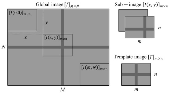 Template matching is a method of locating images based on gray information. As shown in Figure 2, let be the gray matrix of the template image, be the gray matrix of the global image, and be the sub-image cut out from the global image with the upper-left corner coordinates of . The normalized cross-correlation coefficient (NCC) between the template image and the sub-image is defined as follows [17]: