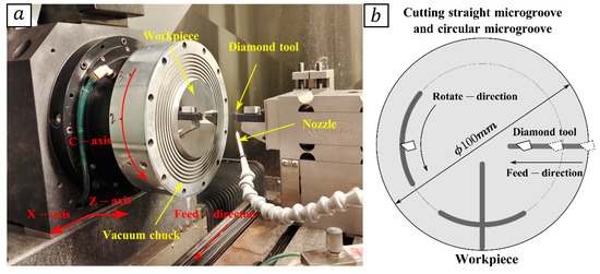 The ultra-precision machining microstructure used in this paper was machined using a single-point diamond cutting method on a Moore ultra-precision lathe (Nanotech 450 UPL, Moore Nanotechnology Systems, Swanzey, NH, USA). The experimental setup and machining process are shown in Figure 3. During the SPDT (single-point diamond turning) process, the workpiece rotates along the C-axis, and the tool feeds along the X-axis direction. The rotational speed and feed rate are controlled to control the relative motion between the tool and the workpiece, thus realizing different machining morphologies. The machining is divided into three steps. In step 1, the workpiece surface is first turned to a mirror finish with a tool radius of 1 mm, a cutting depth of 5 μm, a spindle speed of 1500 r/min, and a feed rate of 0.002 mm/min. In step 2, circular micro-grooves are cut on the obtained mirror surface with a tool radius of 0.1 mm and a cutting depth of 3 μm. In step 3, linear micro-grooves are cut based on step 2, using a tool radius of 0.1 mm and a cutting depth of 3 μm.