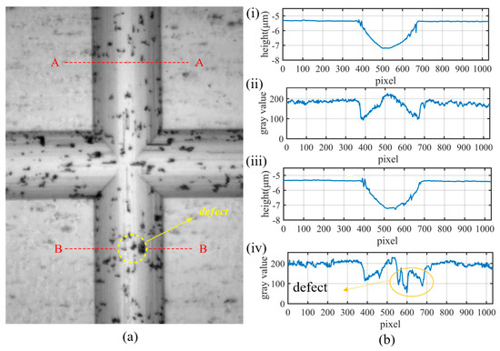 Machining results of ultra-precision machining microstructure; (a) grayscale image of intersecting grooves; (b) distribution of section morphology and grayscale of straight grooves; (i) morphology distribution of micro-groove A-A section; (ii) grayscale distribution of micro-groove A-A section; (iii) morphology distribution of micro-groove B-B section; (iv) grayscale distribution of micro-groove B-B section.