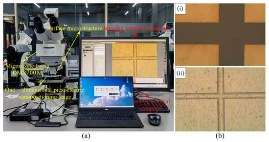 The micro-displacement measurement experimental system is composed of an optical microscopy imaging system, a micro-displacement control system, and the measured workpiece. The Leica DM2700 M microscope (Leica Microsystems GmbH, Wetzlar, Germany) was selected for the optical microscopy imaging system, and its imaging results were controlled and recorded by a computer at the imaging terminal. The P18.X single-axis piezoelectric micro-motion positioning stage from COREMORROW (Harbin, China) was selected for the micro-displacement control system, and the platform was driven by a computer at the control terminal to move the workpiece by several micrometers to the specified position, with a closed-loop resolution of 7 nm. The entire experimental system is shown in Figure 5a.