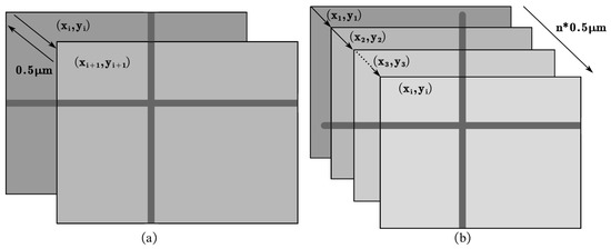 Three−dimensional pulse function of etched morphology and ultra−precision machining microstructure at each pixel position for calculating a displacement of 30 μm using phase correlation method. (a) Three−dimensional pulse function of etched morphology; (b) three−dimensional pulse function of ultra−precision machining microstructure.