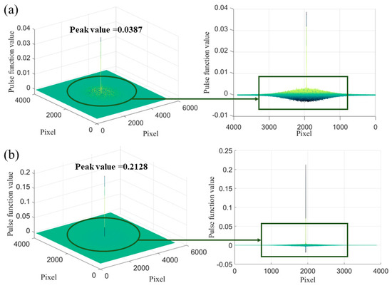 Figure 7 shows the three-dimensional pulse function plots obtained by performing phase correlation calculations on the images captured before and after moving the etched morphology and ultra-precision machining microstructure by 30 μm, respectively. The x-axes and y-axes represent the pixel coordinates of the image, and the z-axis represents the pulse function value. The coordinates corresponding to the maximum value of the pulse function are the pixel values of the observed object’s translation. Figure 7a shows the three-dimensional pulse function plot of the etched morphology, and Figure 7b shows the three-dimensional pulse function plot of the ultra-precision machining microstructure.