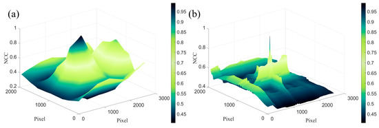 The distribution of NCC values in the global image of etched morphology and ultra-precision machining microstructure at each pixel position for calculating a displacement of 30 μm using the template-matching method. (a) The distribution of NCC values in the global image of etched morphology. (b) The distribution of NCC values in the global image of ultra-precision machining microstructure.